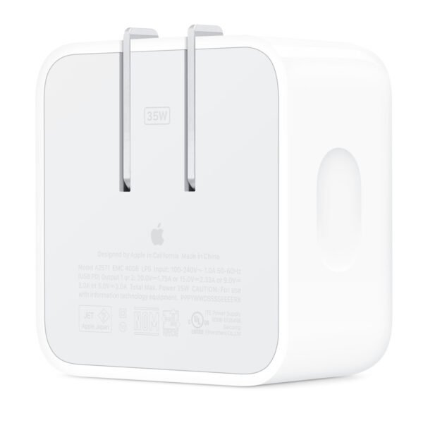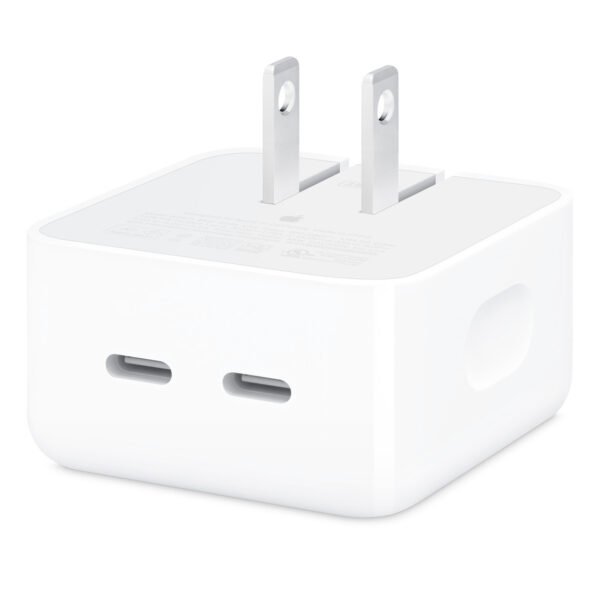 The 35W Dual USB-C Port Compact Power Adapter allows you to charge two devices at the same time, whether you’re at home, in the office, or on the go. The compact size and folding prongs make it easy to pack and store. Apple recommends using it with MacBook Air. You can also use it with iPhone, iPad, Apple Watch, and AirPods.